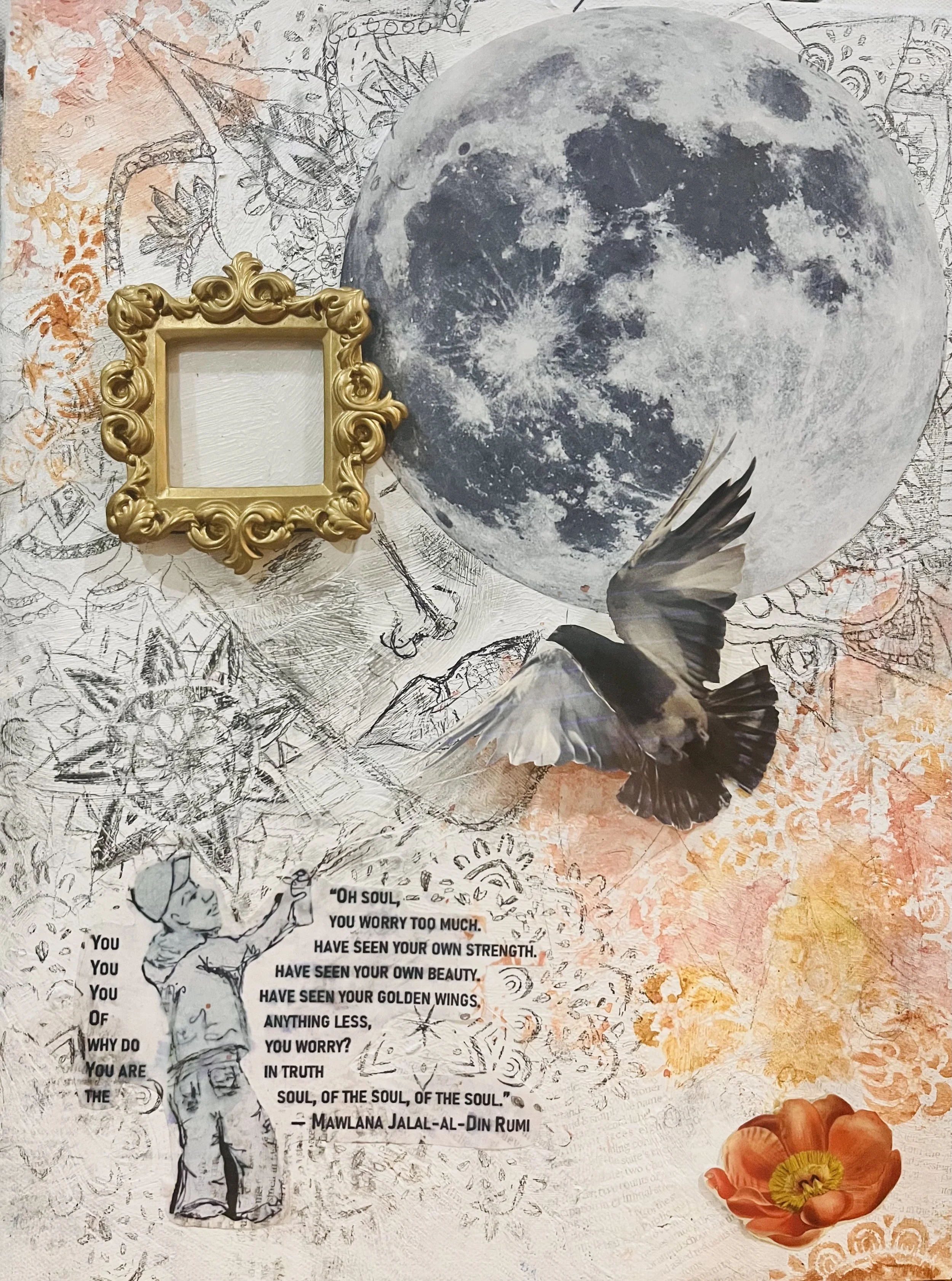 I create canvasses using mostly aerosol, acrylic, newspaper, printed elements, and found objects, to create pieces that reflect the cacophony of internal and external emotional interludes and chaos . While pieces vary in their inspiration, many focus on themes of mental health, neurodivergence, the longing to be seen, light emerging from darkness, and underlying them all, a reflection on where we find ourselves pulled to rest our focus and attention.